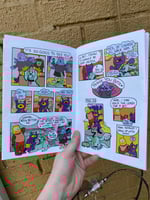 Some fucks and shits, and weed as a McGuffin but not actually consumed. 16+ probably in general sense, but no sex or violence so.. shrugs. Comic is 6x9”, matte cover and semigloss interior pages.